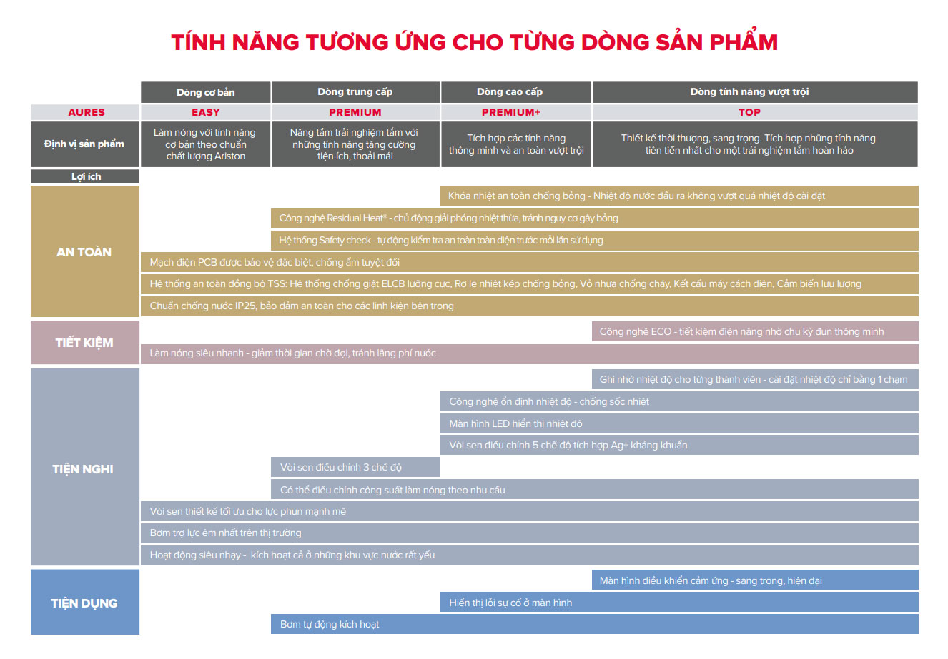 Ngoài tính năng trên, thì máy nước nóng Ariston Aures 2.0 còn tính năng nổi bật khác tương ứng cho từng dòng sản phẩm: