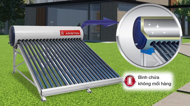 Với máy nước nóng năng lượng mặt trời của Ariston, bình chứa được tráng men Titan cao cấp, không hàn nối từ các tấm inox nên mặt trong của bình chứa phẳng hơn, bảo vệ máy khỏi bị oxi hóa, rỉ sét giúp hạn chế việc nước bị rò rỉ ra bên ngoài. Nhờ đó mà giữ nước nóng lâu hơn và tăng tuổi thọ bình lên gấp nhiều lần so với bình sử dụng mối hàn thông thường. Với ruột Inox SUS 304 không mối hàn, vỏ thép phun sơn tĩnh điện giúp bình giữ nhiệt lâu hơn.