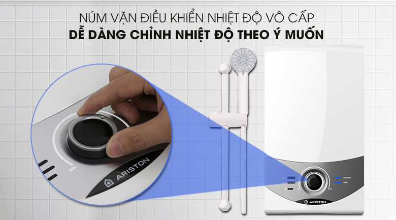 - Núm vặn điều khiển nhiệt độ vô cấp: dễ dàng điều chỉnh nhiệt độ nước nóng tùy theo nhu cầu sử dụng, mang lại cảm giác thoải mái khi tắm.