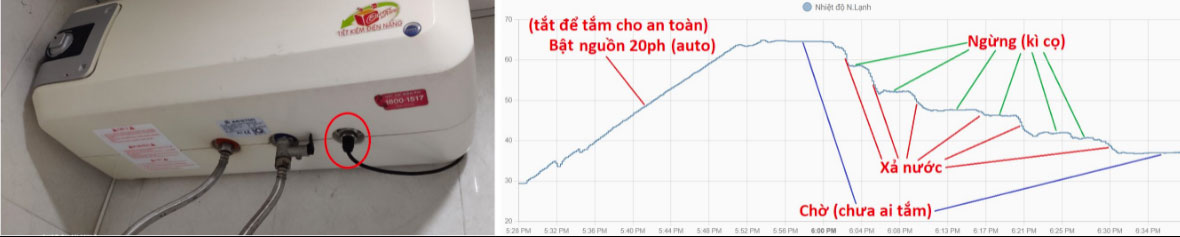 Một người dùng Smarthome đã chia sẽ một bài đăng trên cộng đồng Smarthome Việt về việc tiến hành lắp thêm một đầu đo nhiệt độ nhúng hẵn vào bên trong bình và quan sát đồ thị phản ứng của nhiệt độ nước nóng trong thời gian dài để đưa ra kết luận.