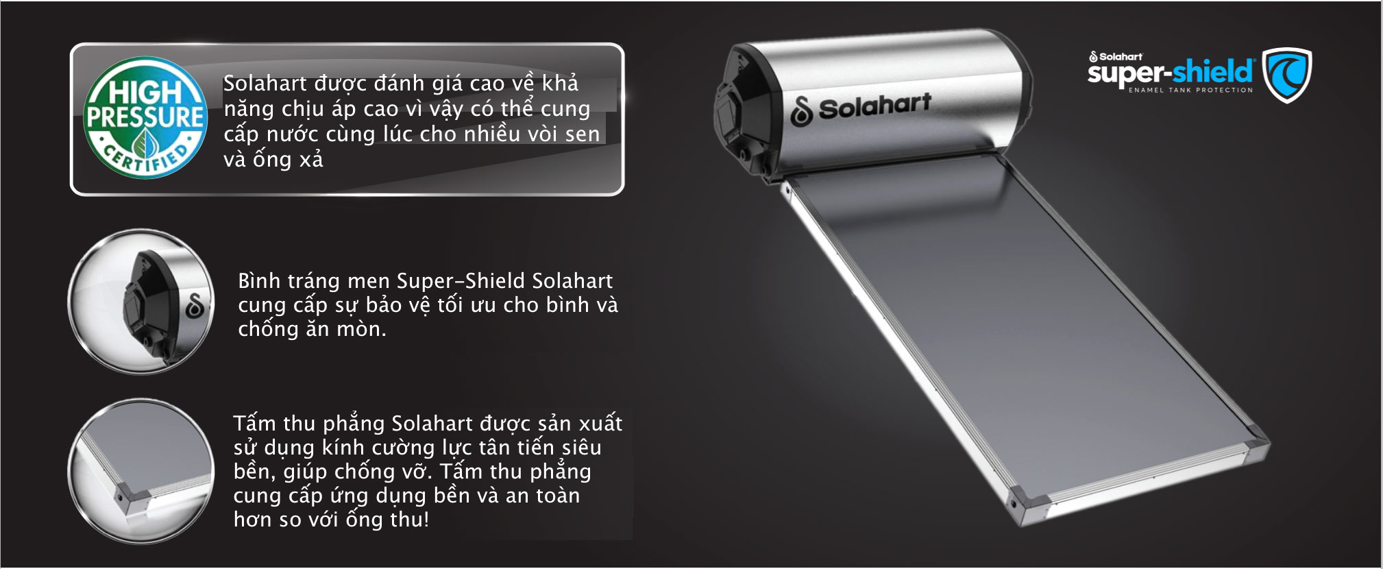 Tấm phẳng thu nhiệt Solahart được sản xuất với kính cường lực gia cố chống vỡ, tấm thu nhiệt dạng phẳng mang đến sự sử dụng chắc chắn hơn, an toàn hơn ống thủy tinh chân không. Tất cả ống thu nhiệt thủy tinh chân không phải chịu sự suy giảm hoạt động do mất chân không. Tấm phẳng thu nhiệt được chế tạo để dùng lâu dài và không dựa vào chân không cho việc hoạt động.